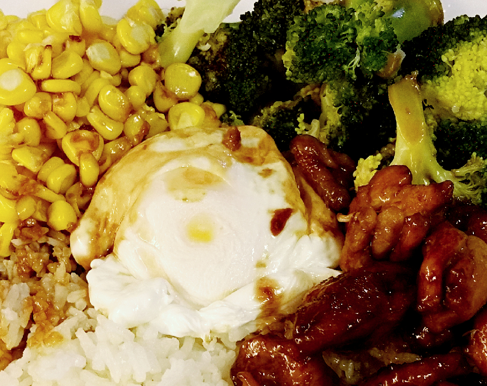 7. Prepare 2 bowls (you can use a plate instead if you bowl can’t fit everything) of rice. Place the corn and brocolli by the side. Top the middle with the chicken and poached egg right on top. You can present it anyway you like it. Drizzle with any remaining sauce all around.