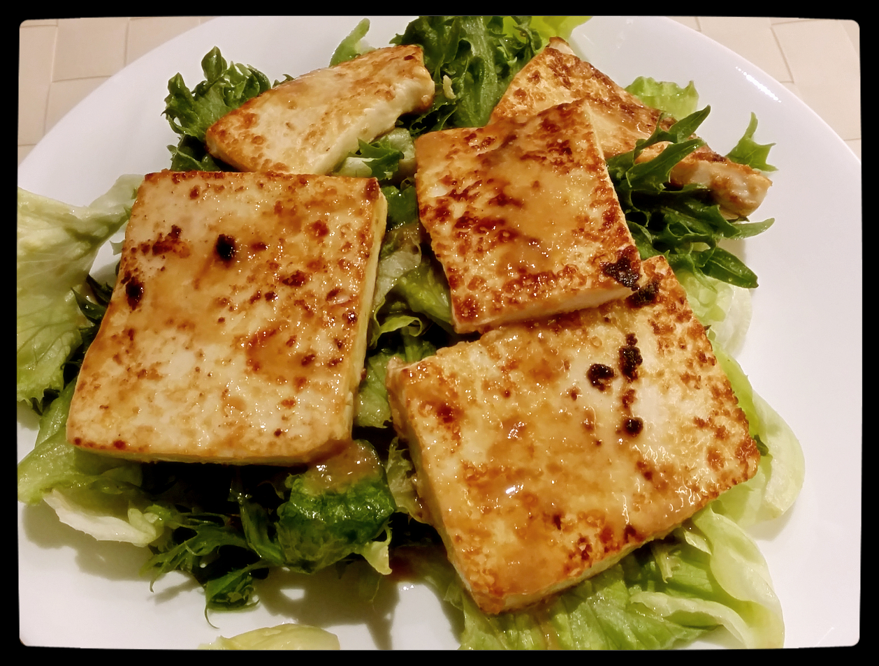 5. Serve the grilled tofu slice on top of your preferred greens and miso salad dressing.