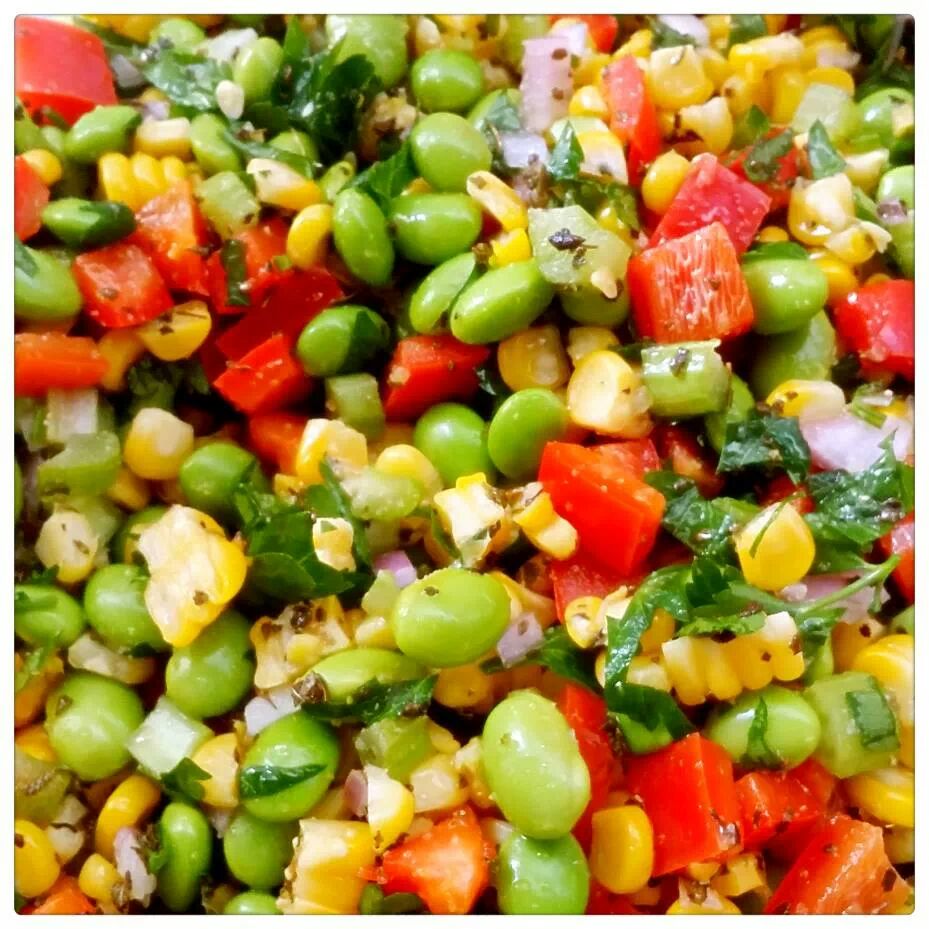 2. For the Oregano Vinaigrette, mix all ingredients in large bowl until well blended. Add edamame, corn, red bell pepper, green onions and parsley; toss well to coat. Cover.