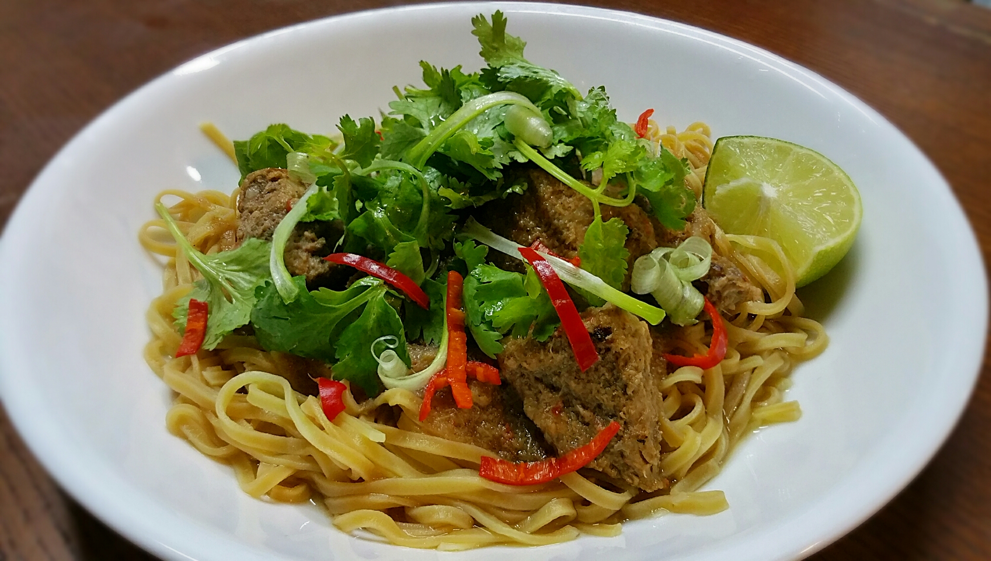 Hot and Sour Rhubarb and Crispy pork with noodles
