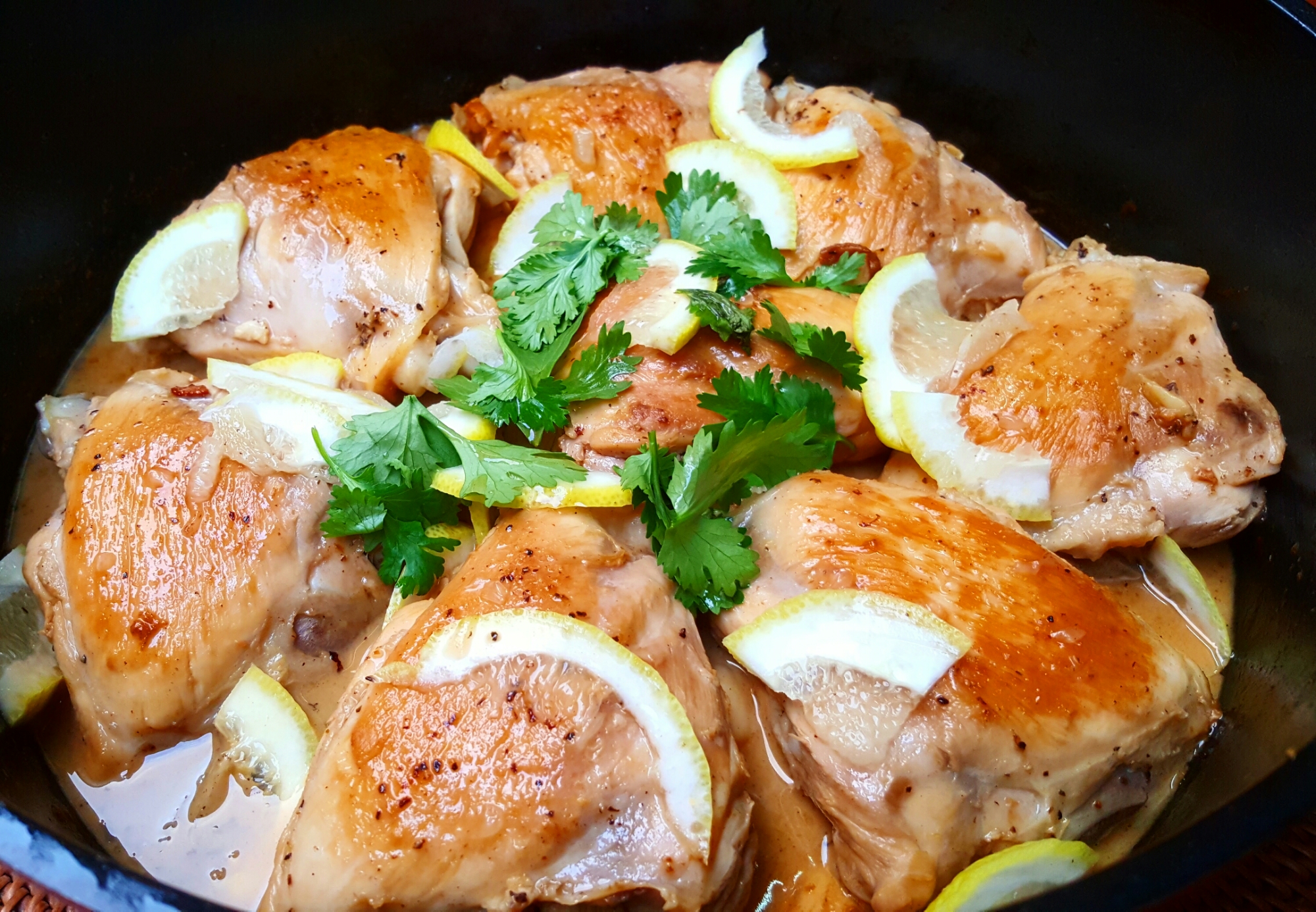 3. Add the butter into the skillet and saute the garlic. Put the chicken back into the skillet (including the juice sipping out of the chicken), follow by the chicken broth, wine, lemon juice and salt. Lower the heat and cover the skillet and let cook for about 10 minutes, turning the chicken over at 5 minutes mark.