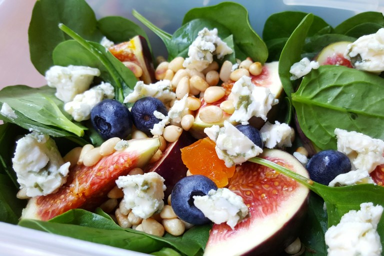 1. Toss spinach/arugula, figs, blue cheese, blueberries and pine nuts together in a large bowl.