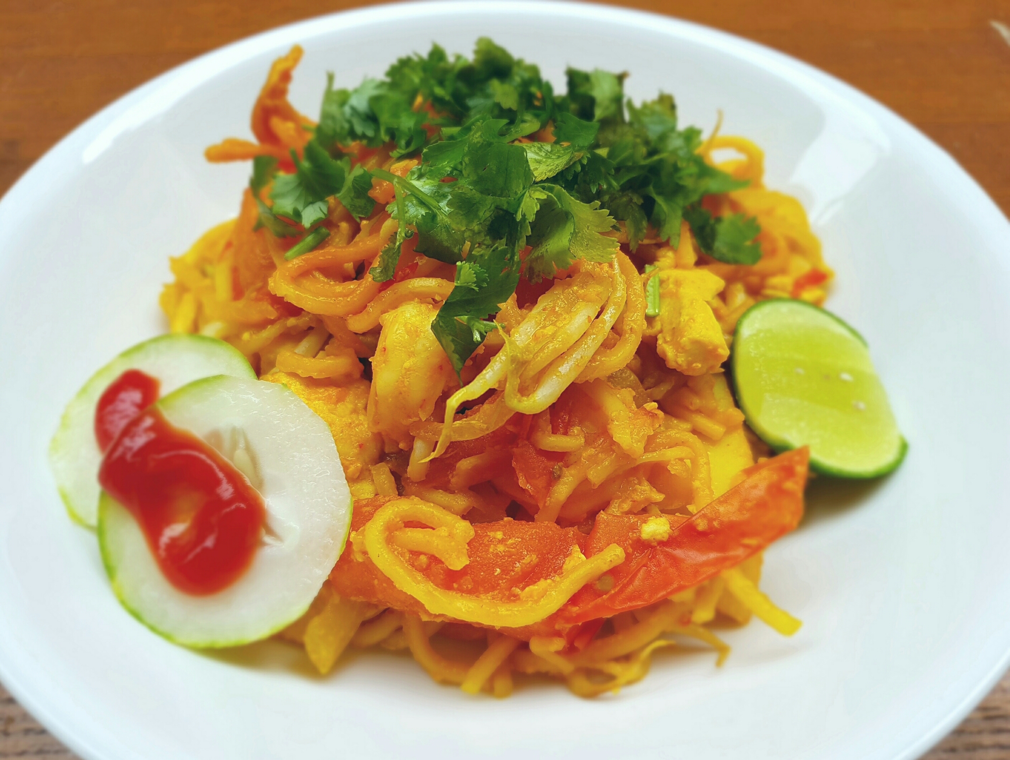 5. Garnish with lime or calamansi, sliced cucumber, sliced tomatoes, additional tomato ketchup or chilli sauce.