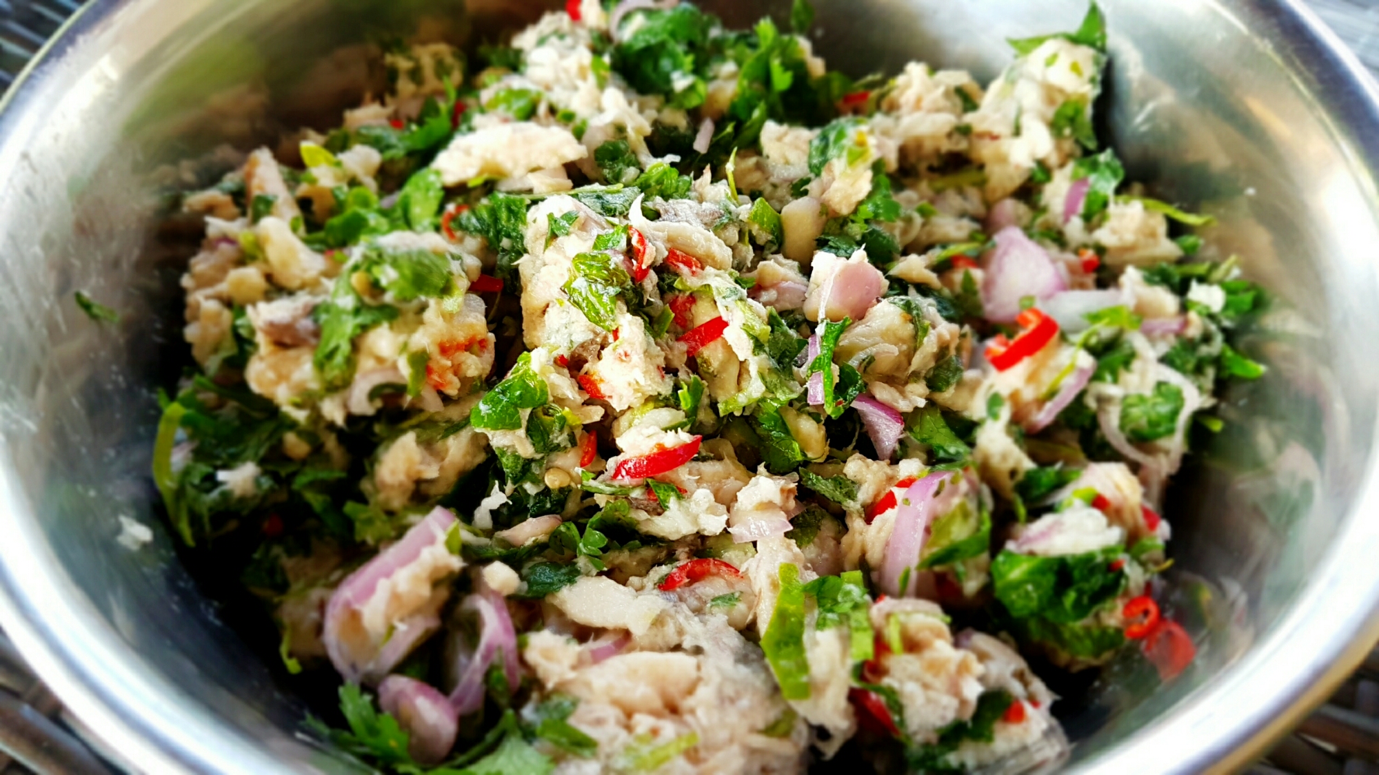 3. Add the lemongrass, shallots, spring onions, ginger, kaffir leaves, mint leaves, lim juice, fish sauce and chillies to the fish. Mix well, taste and adjust seasonings if necessary.