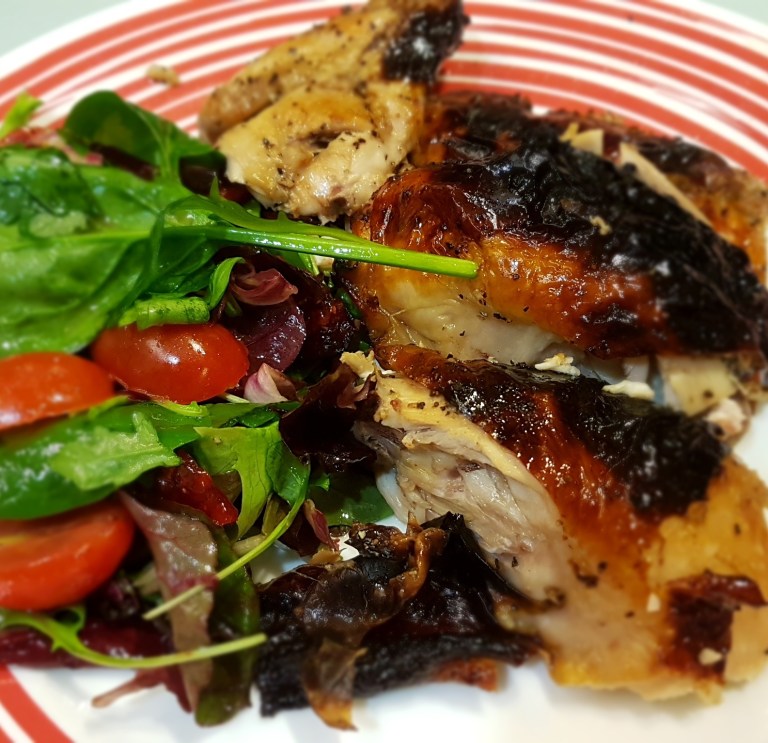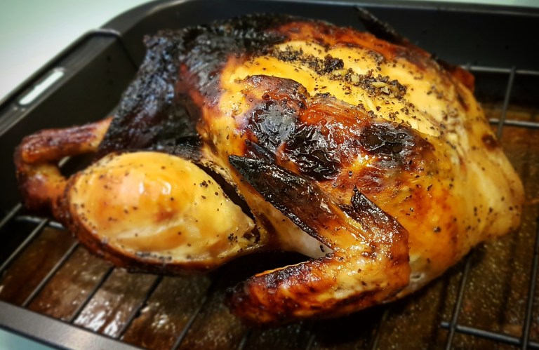 This is my take on a Sunday roast. Chicken is basted in peppery honey marinade which totally melds into the skin.