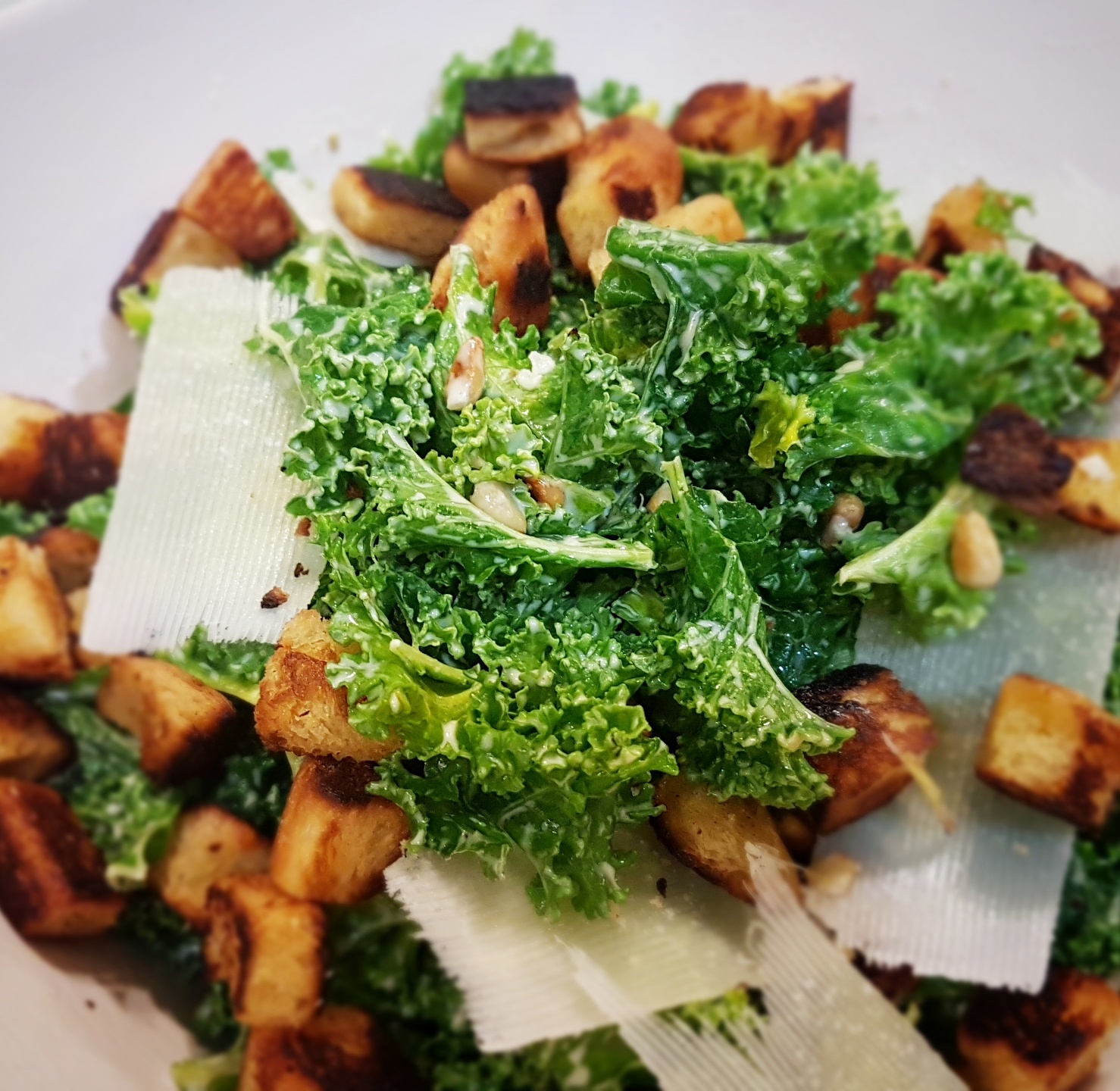 3. Before serving, top the salad with the croutons, pine nuts and shaved Parmesan. If the kale is too dry, add more dressing as needed.