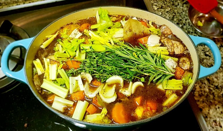 6. Add 4 cups beef stock, bay leaves, thyme, rosemary, celery and ½ tsp pepper to the pot. Stir to combine and bring to a low boil.