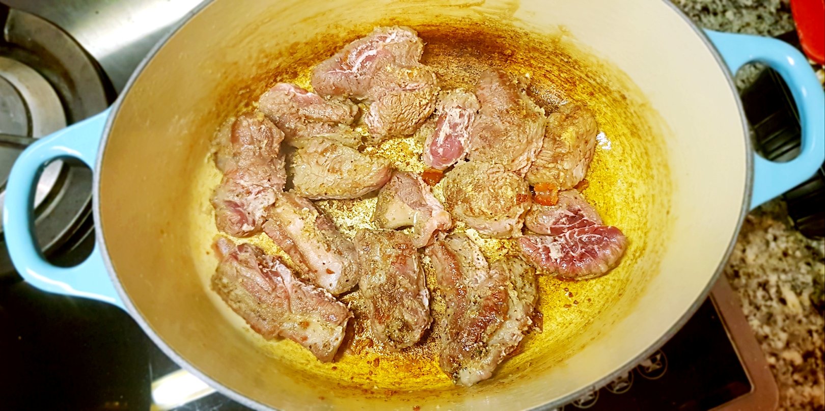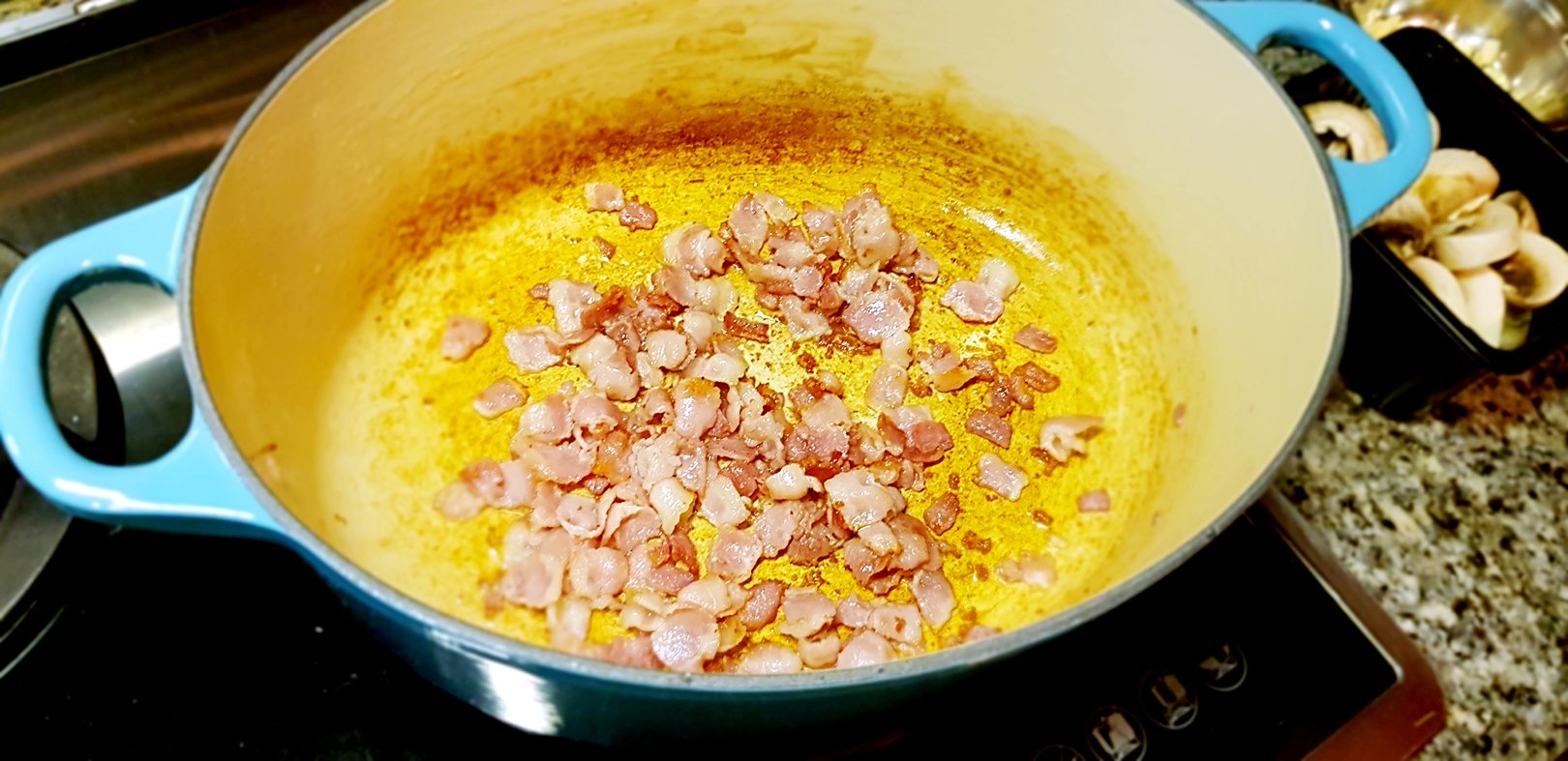 1. In a large, oven-proof pot,(Im using my Le Creuset) sauté bacon over medium heat until golden brown and fat is released. Remove bacon to a separate bowl.