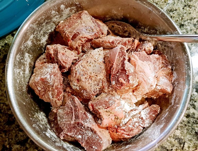 2.While bacon is cooking, place beef in a large mixing bowl and season with ½ Tbsp salt and 1 tsp black pepper. Sprinkle beef with ¼ cup flour and toss and ensure beef is evenly coated.