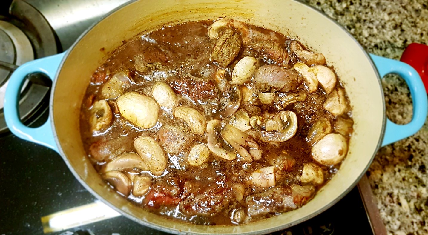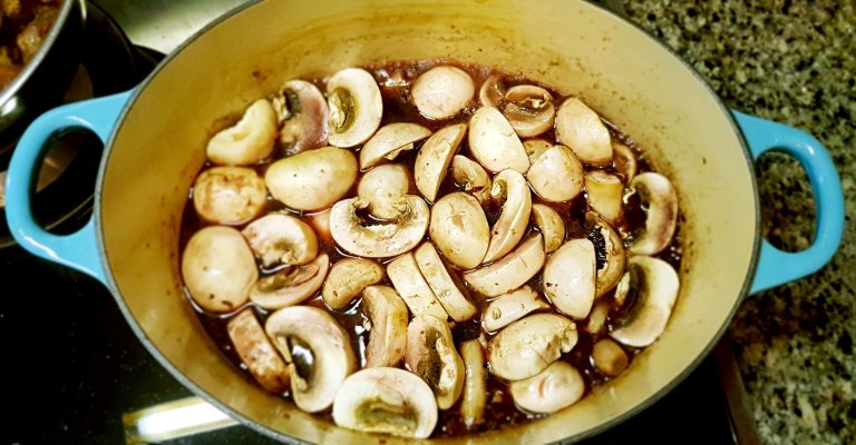 4. Add 2 cups wine to the pot and bring to a boil, scraping the bottom to deglaze the pot. Add sliced mushrooms and simmer over medium heat about 10 min. Return beef and bacon to the pot