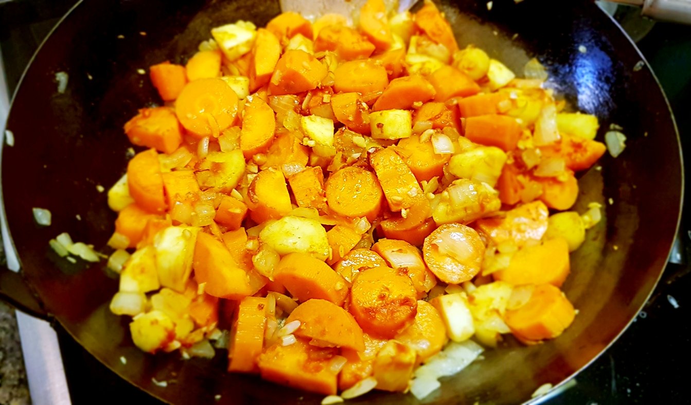 5. Heat a large non-stick skillet over medium/high heat and add olive oil. Add sliced carrots, diced onion, sliced parsnip and 4 chopped garlic cloves, and saute 4 min. Add 2 Tbsp tomato paste and saute another minute. Transfer the veggies to the soup pot.