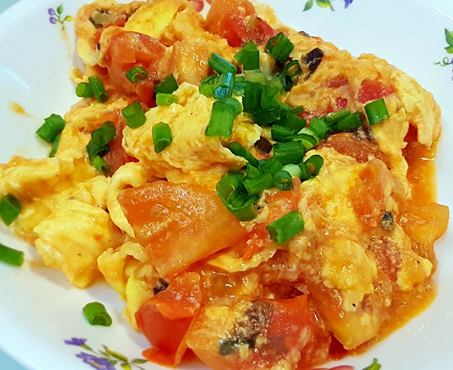 5. Add the tomatoes into the eggs. Stir-fry until everything is mixed. Garnish with some parsley. Serve immediately.