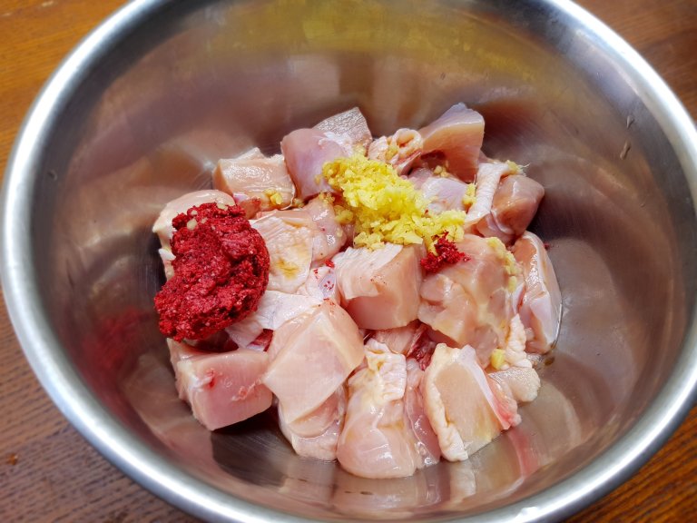 1. In a bowl, marinade chicken for half an hour – an hour.
