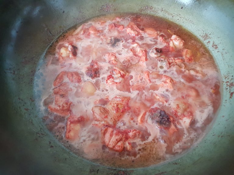 4. Add red glutinous wine. Cover with a lid and simmer for about 10 minutes or until the chicken is cooked, stirring the pot at intervals.
