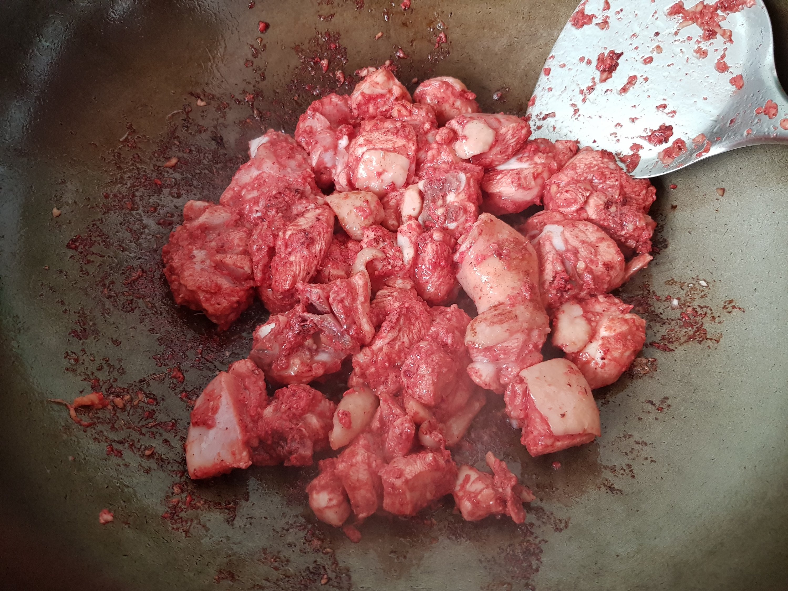 3. With the remaining oil in the wok, stir fry the chicken until they are cooked on the surface.