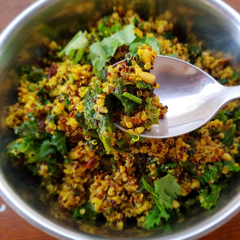1. Bring quinoa to a boil following the instructions on packaging. Cover, reduce heat, and simmer 15 minutes, until all liquid is absorbed. Remove from heat and let sit 5 more minutes with lid on. Fluff with a fork.