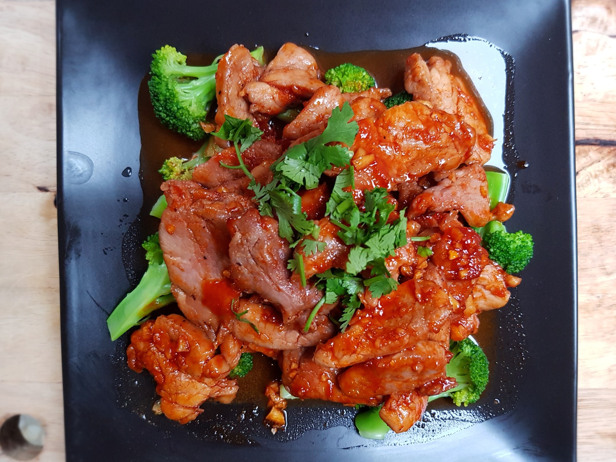 Strips of pork tenderloin (or any pork mear you prefer) glazed with a sticky, sweet, spicy, garlicky, gingery sauce that is easy to whip up. Goes well with steam rice.