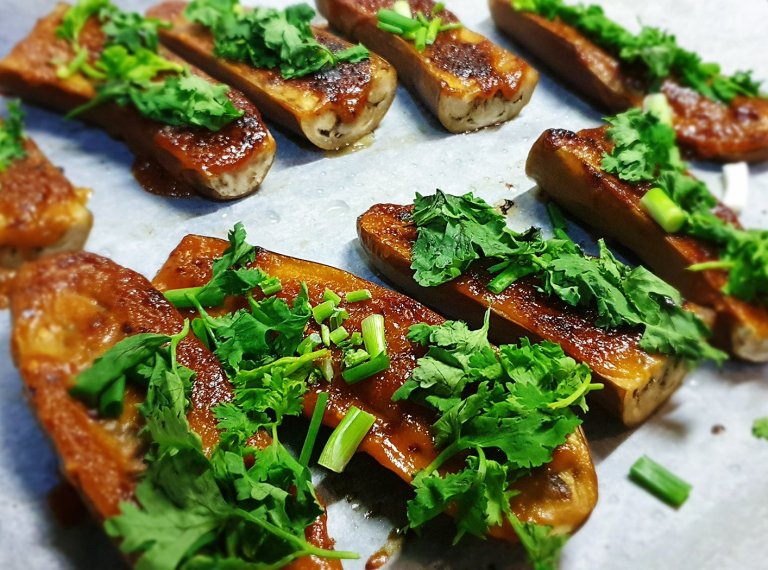 7. Broil the eggplant again until glaze starts to brown and sizzle, about 5 minutes.