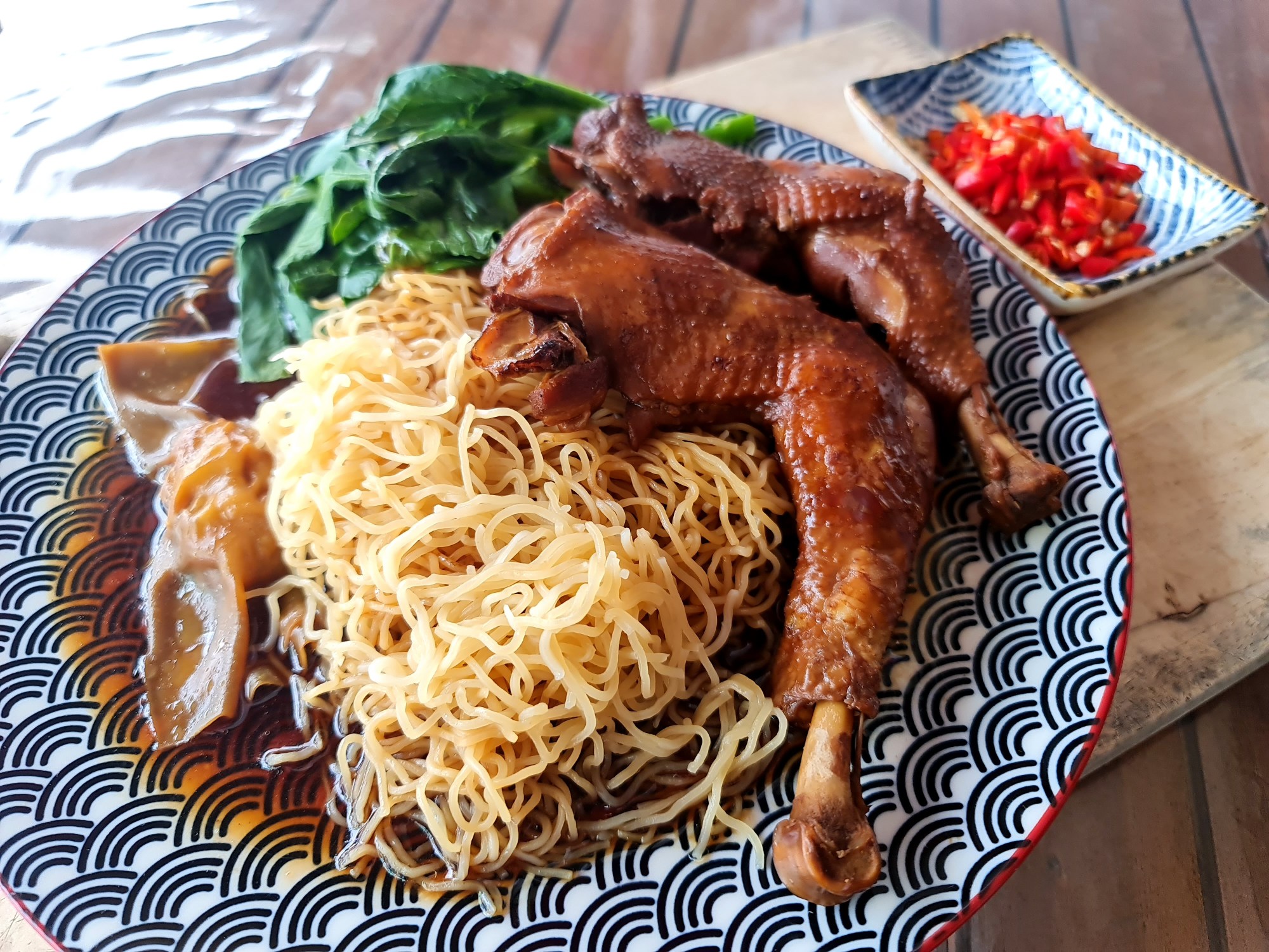Braised soy sauce chicken, together with wanton noodles and pickled chilli. I added shrimp dumplings and balanced off with blanched vegetables.