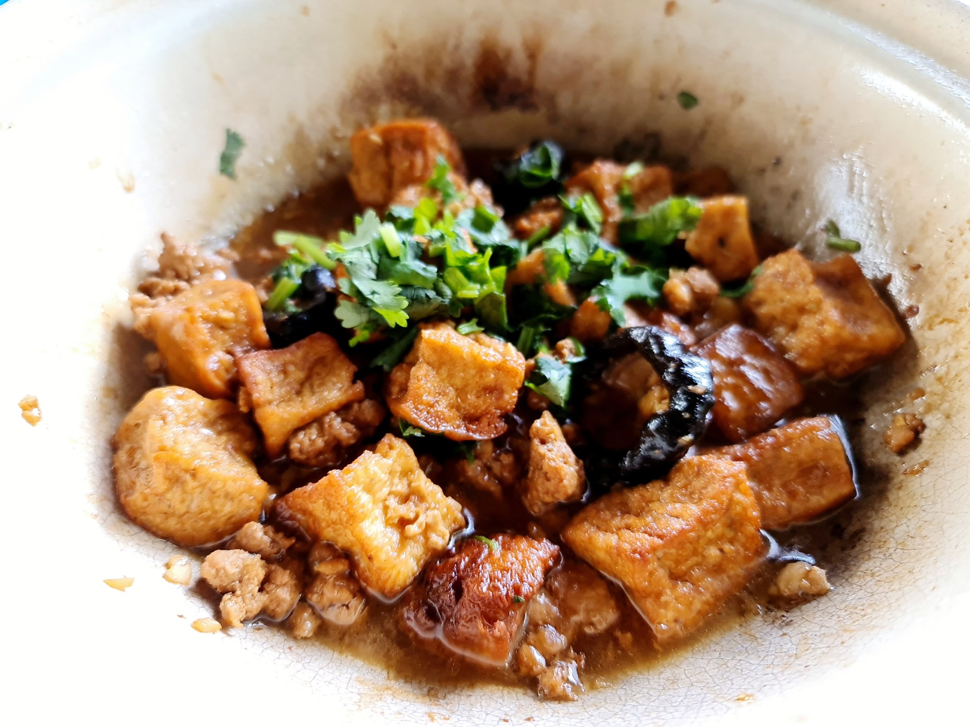 2. Heat up the claypot and add 1 tablespoon of oil. Stir-fry the chopped garlic until aromatic and toss in the ground pork, do a quick stir before adding the mushrooms and the fried bean curd.