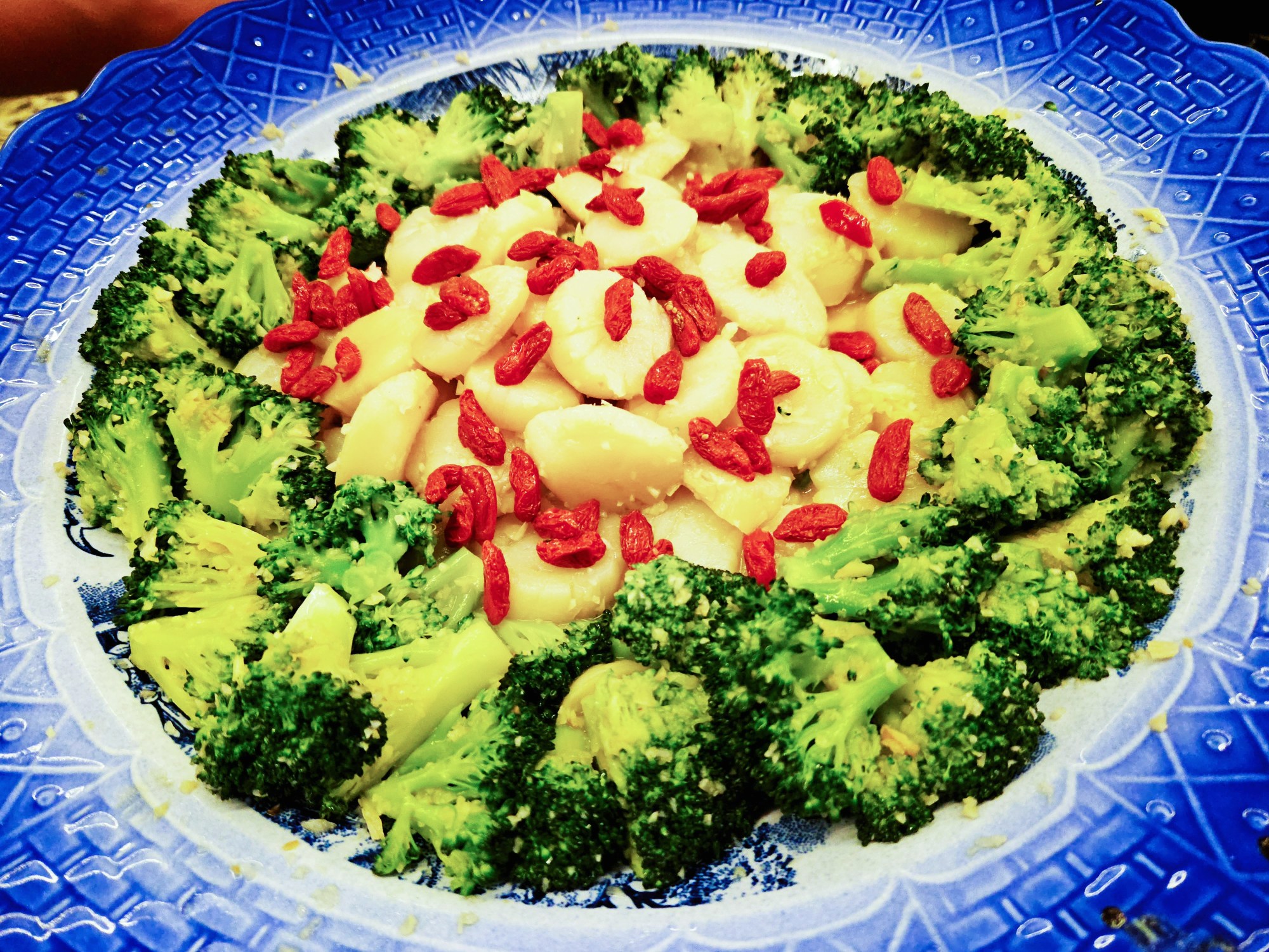 5. Pour in broccoli, half a spoonful of sugar, a little water, goji berries, and half tbsp of chicken powder, stir and stir evenly
